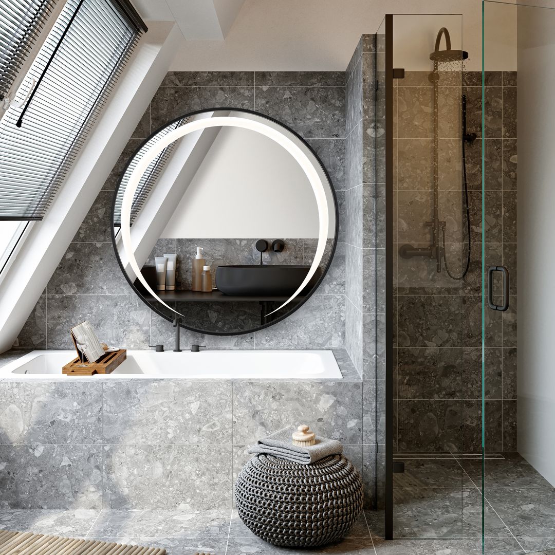 Lustro okrągłe w czarnej matowej ramie mdf z piaskowanym podświetleniem - OTIS LED -...