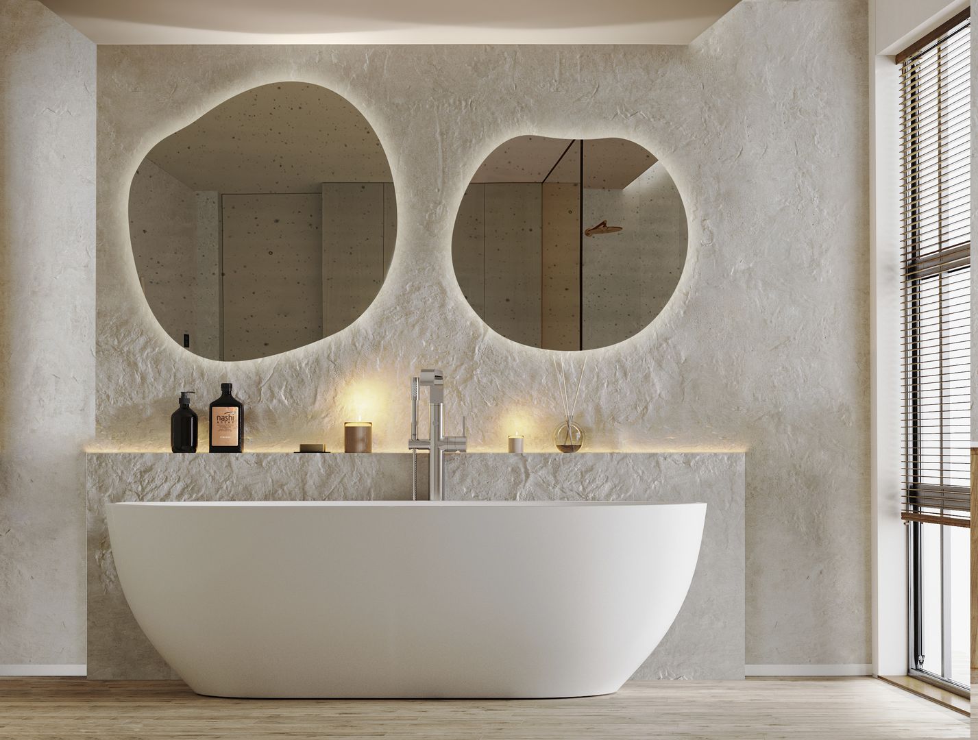 Taki klimat łagodności i harmonii budują lustra okrągłe oraz lustra owalne. Wprowadzają wrażenie miękkości, która jest przeciwwagą dla prostych płytek. Świetnie komponują się z wanną wolnostojącą o podobnych liniach oraz z bateriami kaskadowymi. Efekt płynności wody naśladują lustra organiczne, które także mają miękkie formy, i to właśnie je warto podkreślić oświetleniem LED.
