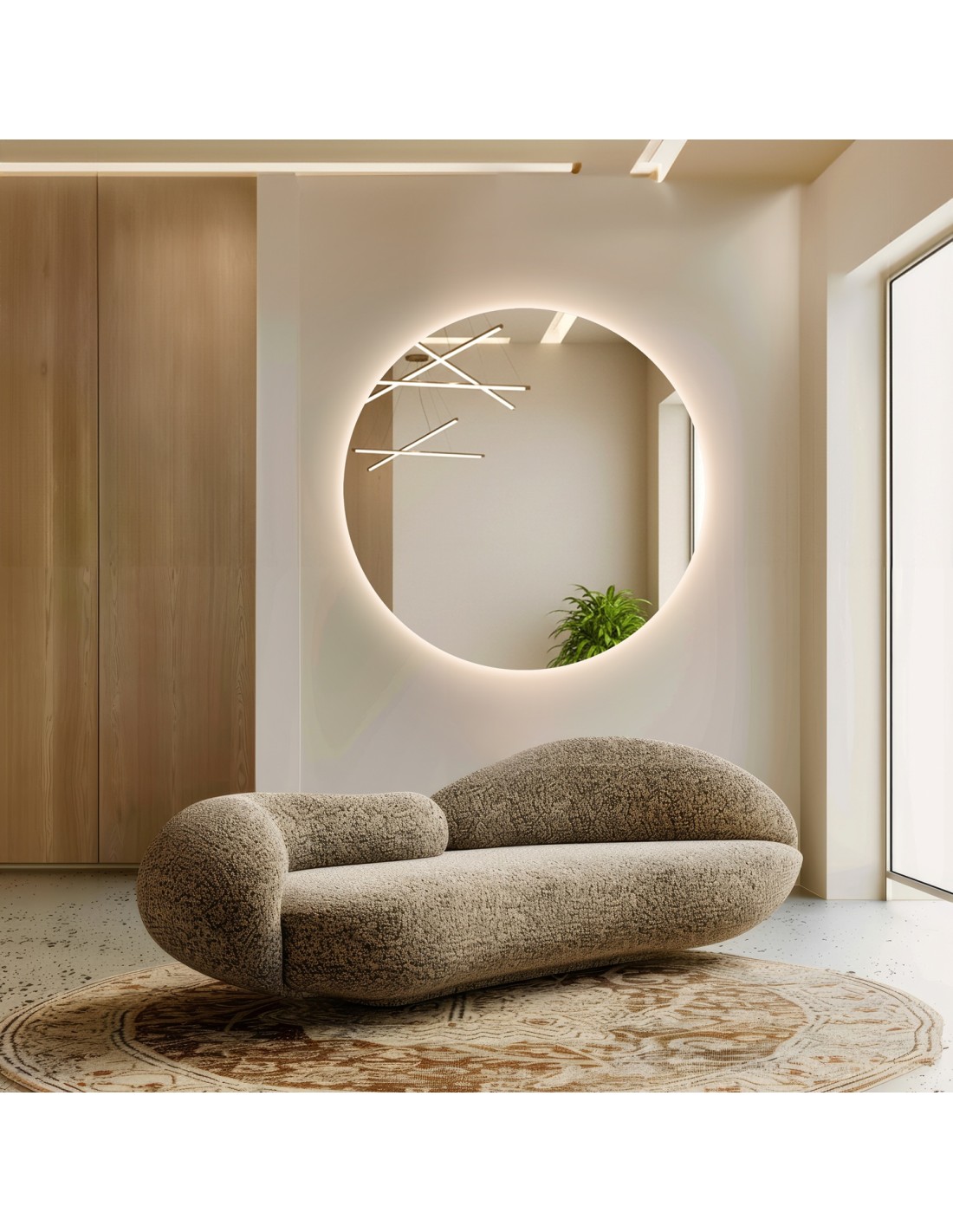 Równomierne światło otula taflę lustra, podkreślając jego formę i dodając przestrzeni wyjątkowej atmosfery. Energooszczędna technologia LED łączy efekt wizualny z funkcjonalnością najwyższej klasy.