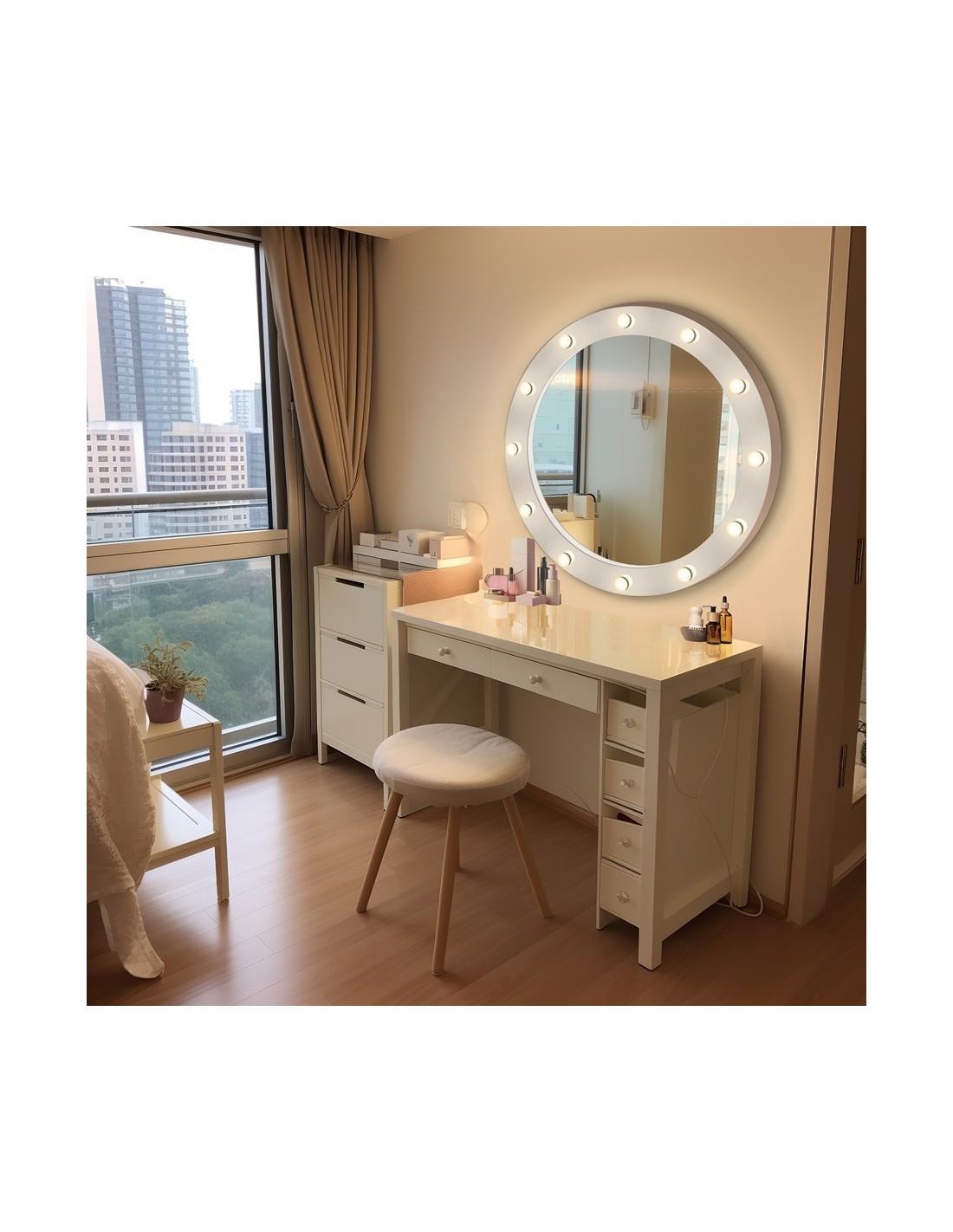Specyfikacja: Lustro okrągłe kosmetyczne NEW YORK z żarówkami (barwa neutralna) w ramie białe MDF i z zabudową MDF